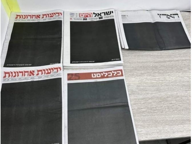 فوجئ (الإسرائيليون)، صباح الثلاثاء، بطباعة الصحف العبرية الكبرى، لصفحاتها الأولى باللون الأسود بدون أي كتابة أخرى.