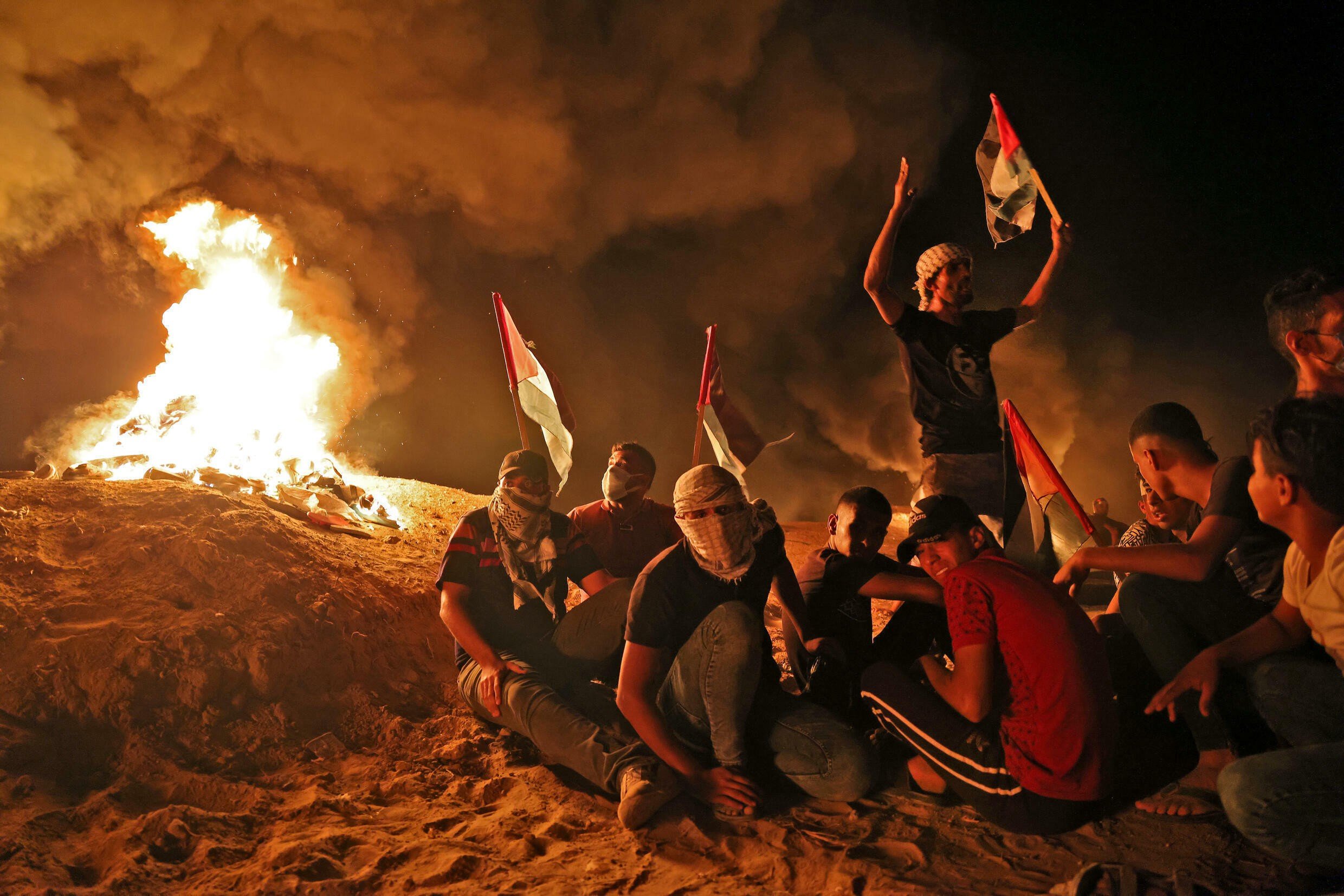 ورفع الشبان الذين توافدوا إلى منطقة مخيم ملكة شرق غزة، أعلام فلسطين، كما نفذوا فعاليات إرباك ليلي نتج عنها أصوات انفجارات، وأشعلوا الإطارات المطاطية.
