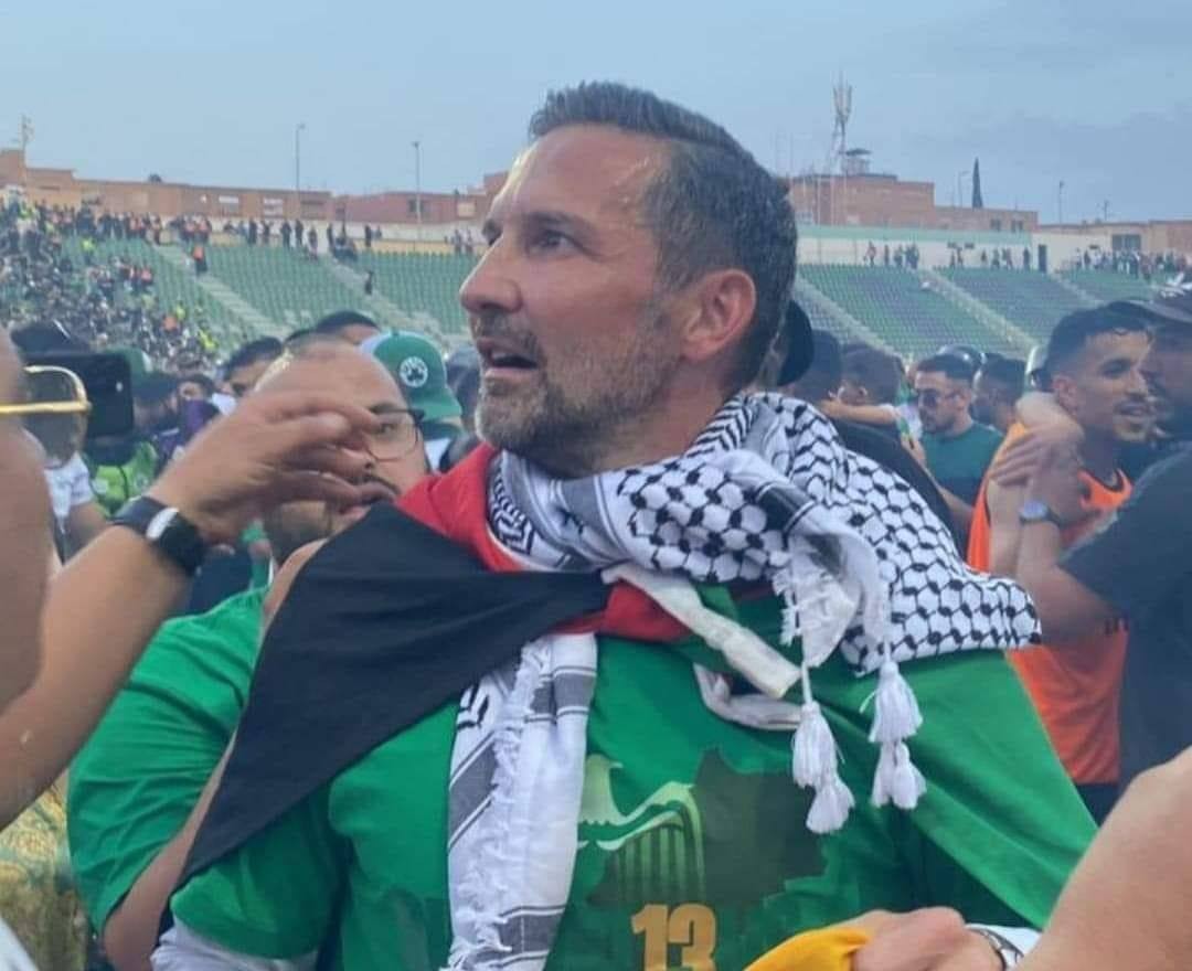 تضامن الألماني جوزيف زينباور مدرب الرجاء  البيضاوي  مع القضية الفلسطينية بعدما التحف بعلم وكوفية فلسطين أثناء تتويج فريقه بلقب الدوري المغربي.