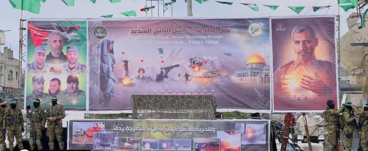 ووفقا لمراسل الجزيرة هاني الشاعر، فإن منصة التسليم جاءت محملة برسائل سياسية وأمنية، حيث وُضعت على يمينها صورة القائد العام لكتائب القسام محمد الضيف.