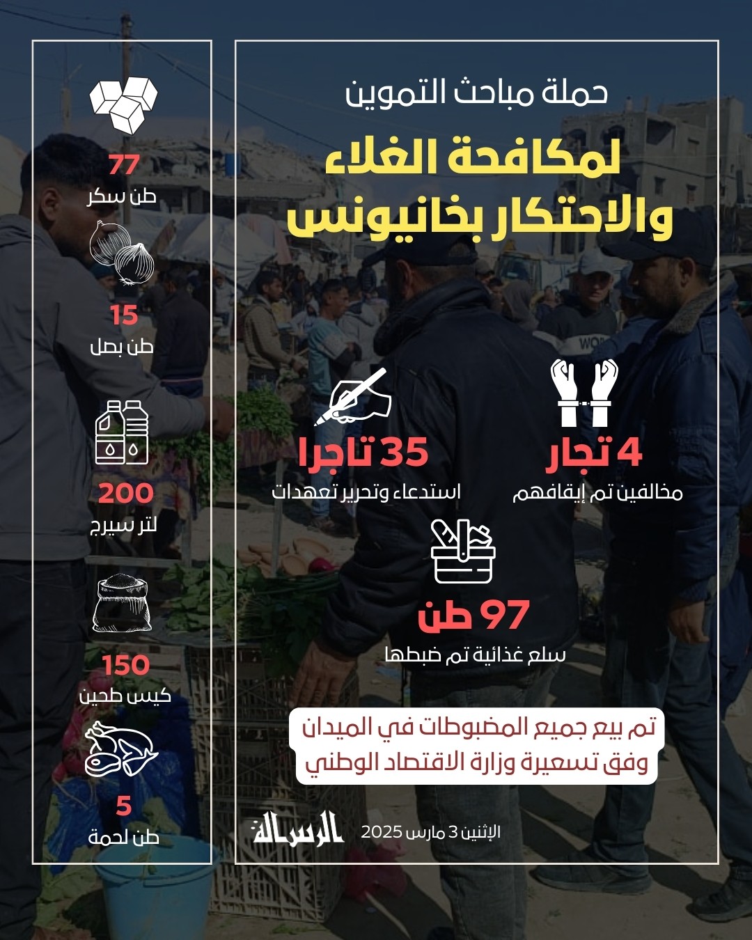 نفذت شرطة مباحث التموين في محافظة خانيونس، جنوبي قطاع غزة، اليوم الاثنين 3 مارس، حملة واسعة لمكافحة غلاء الأسعار واحتكار السلع، أسفرت عن ضبط كميات كبيرة من المواد الأساسية، واتخاذ إجراءات قانونية بحق عدد من التجار المخالفين.