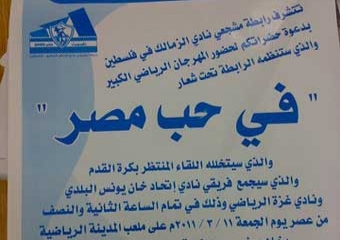 أعلن السيد سهيل نشوان رئيس رابطة مشجعي الزمالك في فلسطين عن إقامة مباراة كرة قدم بين فريقي نادي غزة الرياضي واتحاد خان يونس على كأس الثورة المصرية، وذلك يوم الجمعة القادمة على ملعب المدينة الرياضية في خان يونس.