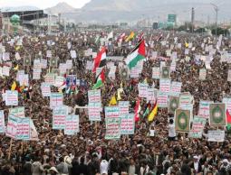 ورفع المتظاهرون الأعلام اليمنية والفلسطينية، إضافة إلى لافتات تندد باستمرار "جرائم القتل والإبادة الجماعية والتجويع والتدمير بحق الشعب الفلسطيني في قطاع غزة" .
