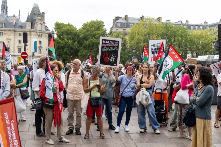 وفي باريس استنكر المتظاهرون الخطة الإسرائيلية لاجتياح مدينة غزة، ودانوا ما وصفوه بالصمت الدولي إزاء ما يحدث في القطاع. كما ندد المحتجون باستهداف الصحفيين معتبرين أن ذلك يمثل محاولة لإخراس الشهود.
