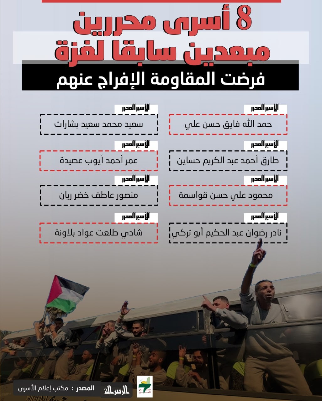 انفوجرافيك: 8 أسرى محررين مبعدين سابقا لغزة فرضت المقاومة الإفراج عنهم