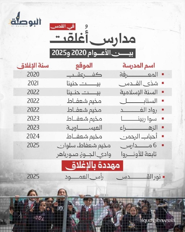 شهدت القدس المحتلة خلال السنوات الخمس الماضية موجة متصاعدة من إغلاق المدارس الفلسطينية، في سياق سياسات إسرائيلية ممنهجة تستهدف محو الهوية الوطنية وإعادة تشكيل وعي الأجيال القادمة، مما أدى هذا التوجه إلى إيقاف تراخيص العديد من المدارس من قبل وزارة المعارف الإسرائيلية، نتيجة رفضها تدريس المنهاج الإسرائيلي أو المنهاج المحرّف الذي يهدف إلى محو المقررات التعليمية الوطنية الفلسطينية.