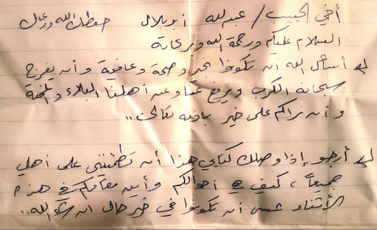 في رسالته الخطّية الأخيرة قبيل استشهاده، كتب أبو عبيدة بخط يده جملة قصيرة لا تشبه اللغة العسكرية التي عهدها الناس منه، بل تشبه لغة الأبناء الذين يخشون أن ينقطع حبل التواصل فجأة: “أسأل الله أن تكونوا بخير وصحة وعافية وأن يفرج سبحانه الكرب ويرفع عنا وعن أهلنا البلاء والمحنة وأن نراكم على خير بإذنه تعالى.. أرجو إذا وصلك كتابي هذا أن تطمئنني على أهلي جميعا، كيف هي أحوالكم، وأين مقامكم في هذه الأثناء، عسى أن تكونوا في خير حال إن شاء الله."