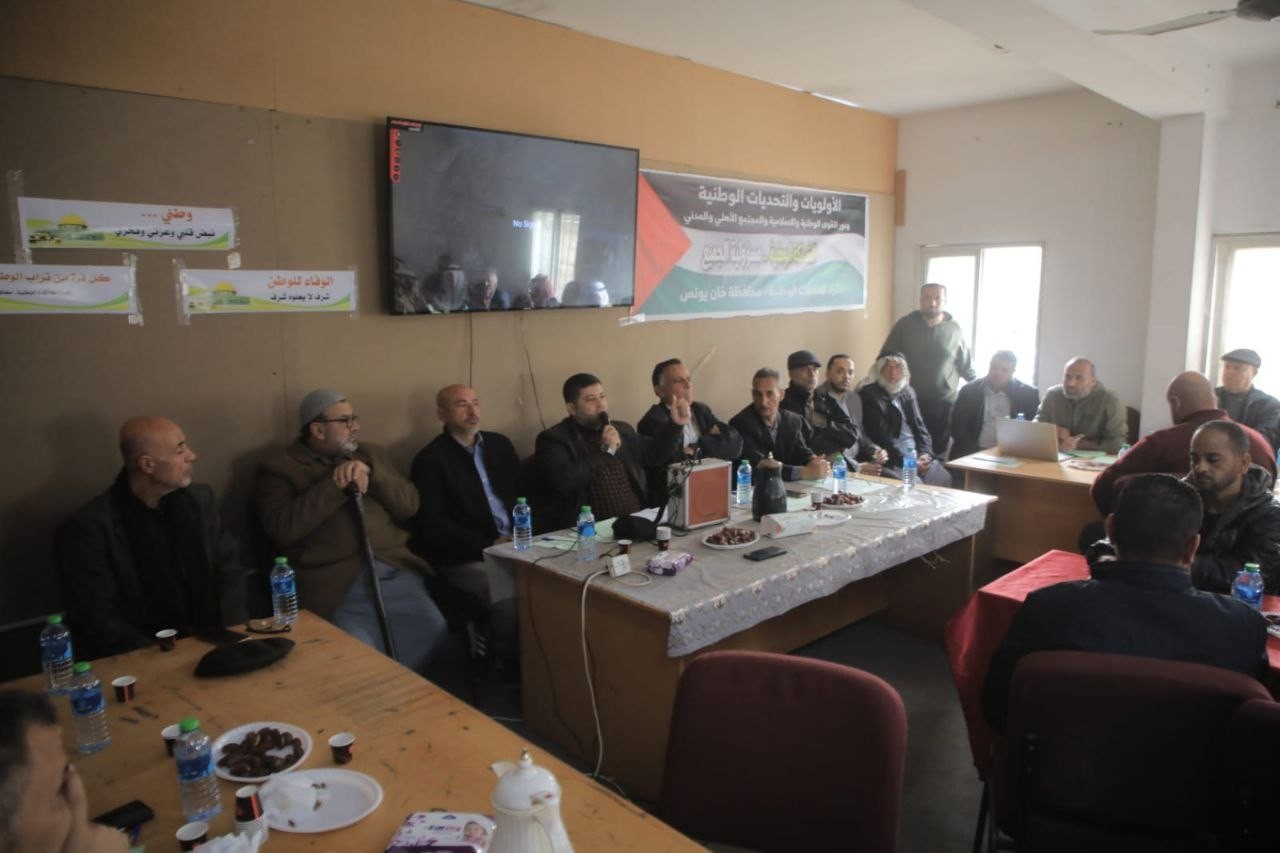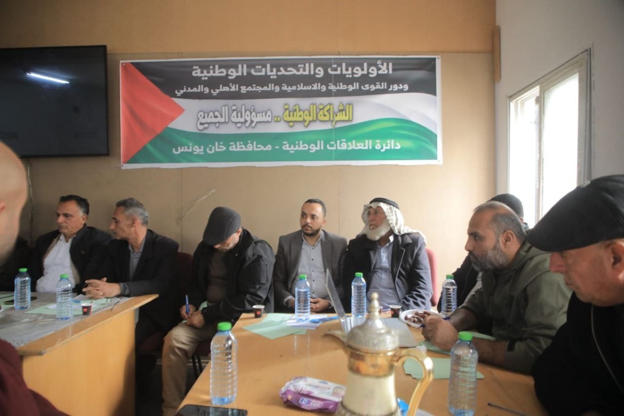 عقدت دائرة العلاقات الوطنية بمحافظة خانيونس، يوم السبت، ورشة عمل بعنوان "الأولويات والتحديات الوطنية ودور القوى الوطنية والإسلامية والمجتمع المدني والأهلي"، بمشاركة واسعة شملت ممثلين عن جميع القوى الوطنية والإسلامية وفصائل المقاومة، بالإضافة إلى مؤسسات المجتمع الأهلي والمدني والتيار الإصلاحي القائم على العمل الإغاثي في "الفارس الشهم".