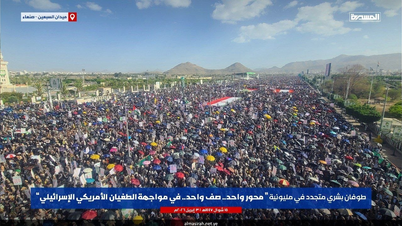 وأقيمت الفعالية في ميدان السبعين، أكبر ميادين العاصمة، تحت شعار: “ثابتون مع فلسطين ولبنان وإيران.. وجاهزون لكل الخيارات”، وذلك استجابة لدعوة زعيم جماعة الحوثي، عبدالملك الحوثي.