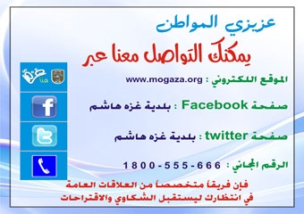 أطلقت إدارة العلاقات العامة و الإعلام في بلدية غزة خدمة التواصل المباشر مع مواطني مدينة غزة لاستقبال اقتراحات و استفسارات و شكاوي المواطنين و الإجابة عليها، عبر رقم مجاني خاص (1800-555-666) يمكن لأي المواطن الإيصال عليه .