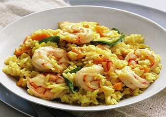 في قدر صغير سخني 1 كوب من الماء، 2 ملعقة كبيرة من الزيت، وزعيه فوق الارز غطى القدر بإحكام , خففى النار واتركى القدر الى ان ينضج الارز يتراوح الوقت من 20 – 25 دقيقة ضعى الارز بالروبيان في طبق التقديم، انثرى عليه المكسرات.