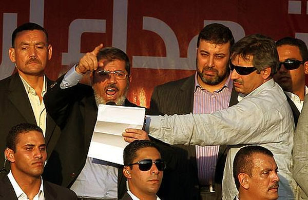 وفي ما بدا أشبه بتحد لقيادة المؤسسة العسكرية انضم مرسي أمس إلى حشود غفيرة تجمعت في ميدان التحرير في "مليونية تسليم السلطة"، حيث أدى رمزيا اليمين في هذه الساحة التي ترمز إلى الثورة المصرية.