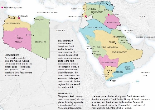 عرضت صحيفة نيويورك تايمز الأمريكية خريطة تظهر فيها خمس دول في الشرق الأوسط وقد قسمت إلى 14 دولة، وذلك بفعل النزاعات الطائفية والسياسية الدائرة حاليا، وذلك وفقا للمحلل روبن رايت.