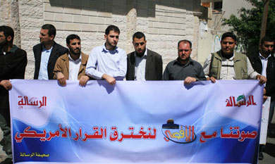 اعتصم عشرات الصحفيين والصحفيين قبالة مقر فضائية الأقصى وسط مدينة غزة ، وذلك تنديا بقرار الخزانة الأمريكية تجميد أرصدة الفضائية في البنوك ، وقد شارك فيه عدد كبير من المثقفين والاكادميين وفصائل المقاومة الفلسطينية .