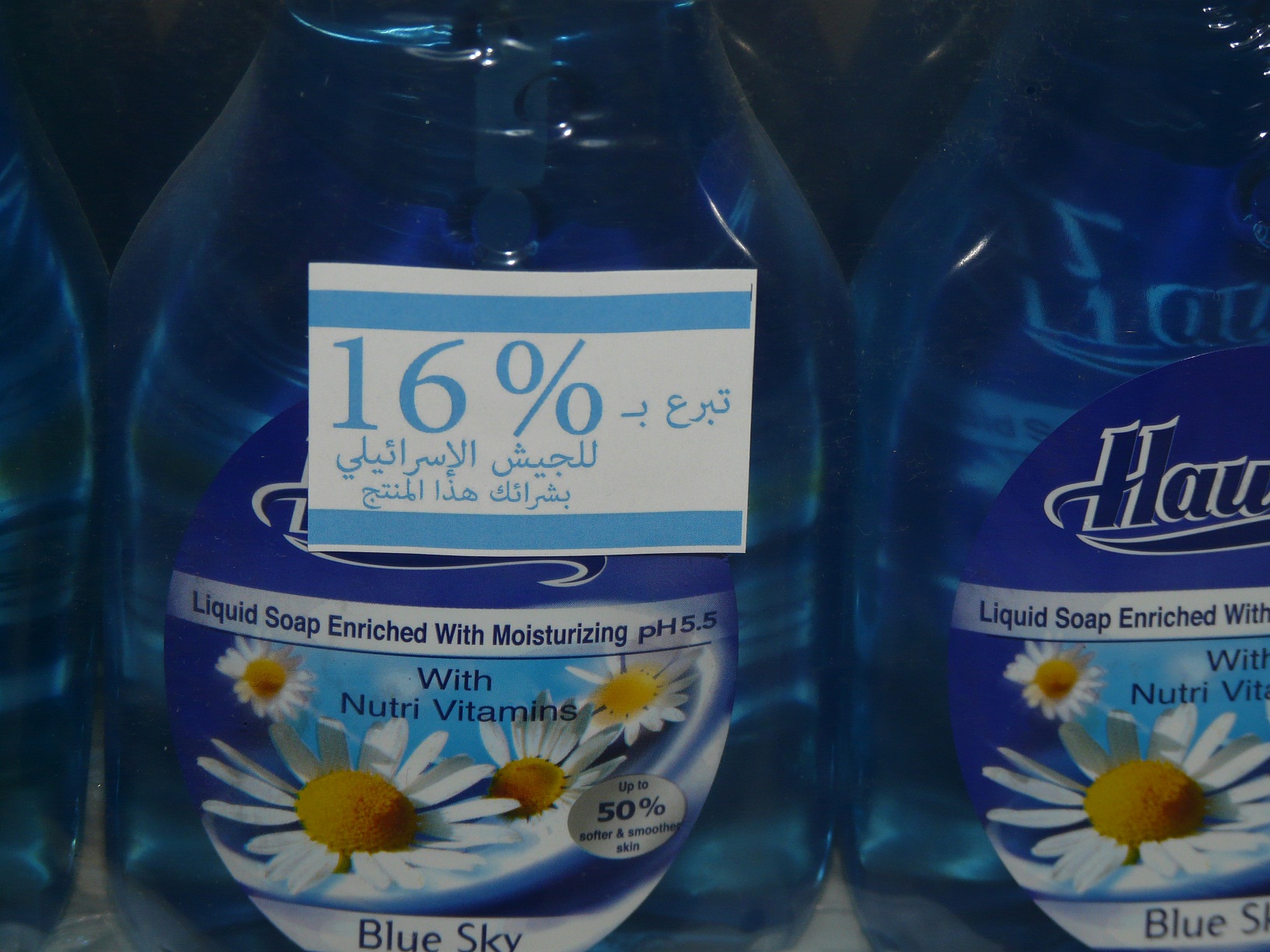 "عيب عليك.. منتجات وطنك أولى"، "تبرع للجيش (الإسرائيلي) بـ16% عند شرائك هذا المنتج"، وغيرها من العبارات المنفرة، ألصقت على المنتجات (الإسرائيلية) في عدد من المجمعات والمحال التجارية بالضفة المحتلة، في إطار حملات مقاطعة البضائع (الإسرائيلية).